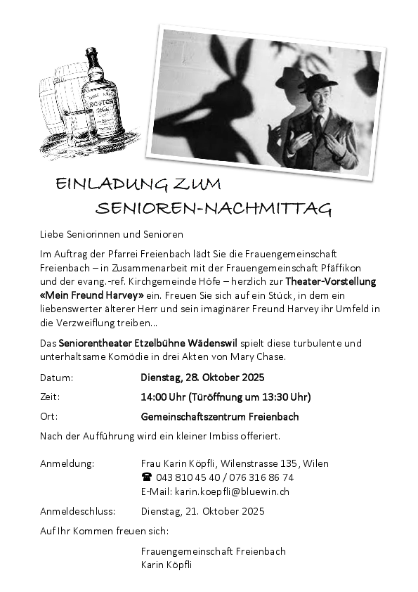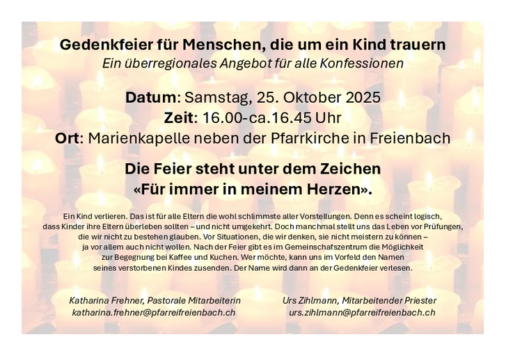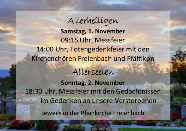 Wenn Sie alle Informationen unseren Pfarreien elektronisch erhalten möchten, können Sie sich per E-Mail (newsletter / @ pfarreifreienbach.chnewsletter) für den Newsletter der Pfarrei Freienbach / Pfäffikon anmelden. @ pfarreipfaeffikon.ch