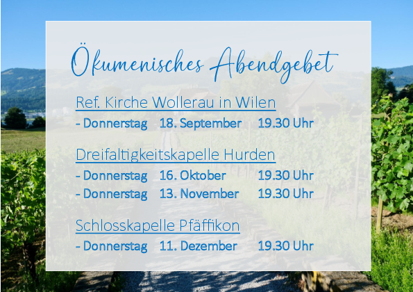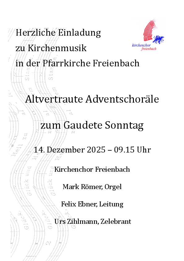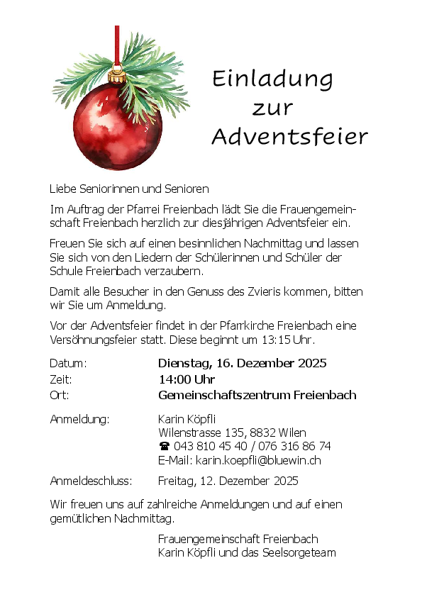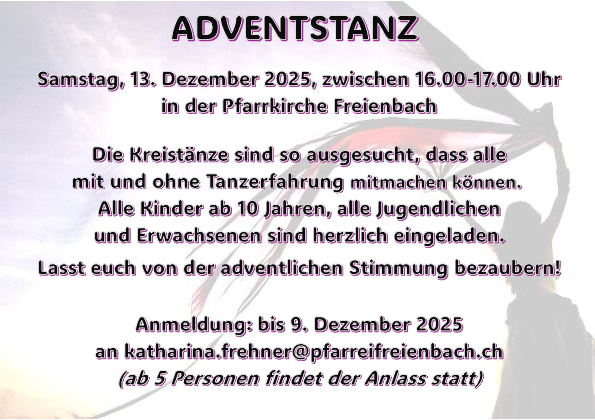 Wenn Sie alle Informationen unseren Pfarreien elektronisch erhalten möchten, können Sie sich per E-Mail (newsletter@pfarreifreienbach.ch /newsletter@pfarreipfaeffikon.ch) für den Newsletter der Pfarrei Freienbach / Pfäffikon anmelden.