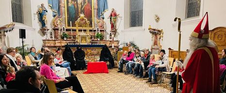 Am Vorabend des Festes zum Hl. Nikolaus durften wir in einer sehr schönen und stimmigen Feier den Samichlaus und die Schmutzlis in unserer Mitte begrüssen. Nicht nur die Augen der Kinder waren gross und haben geleuchtet. Schliesslich wurden auch bei Erwachsenen so manche Kindheitserinnerungen geweckt. Der Samichlaus hat sich für jedes Kind persönlich Zeit genommen. Dabei haben die Kinder mit Sprüchen, Gedichten, selbstgemalten Bildern, gebastelten Sachen und sogar mit einem Musikstück den Samichlaus beschenkt, der wiederum mit den Gaben aus seinem reich gefüllten Sack den Kindern Freude bereitet hat. Im Anschluss war er auf Besuch bei den Familien in unserer Pfarrei.