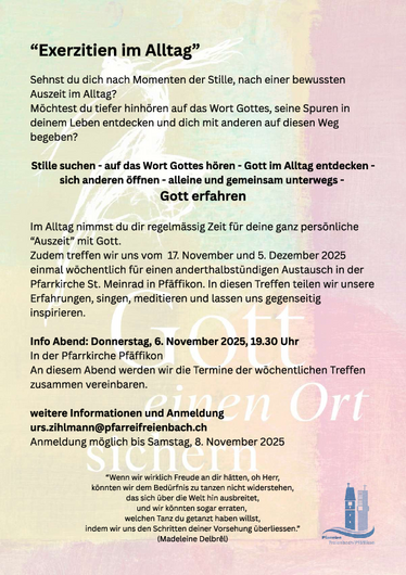 Anmelden bis 24. November bei Urs Zihlmann (urs.zihlmann@pfarreifreienbach.ch) oder Pfarramt Pfäffikon (pfarramt@pfarreipfaeffikon.ch / 055 410 22 65)