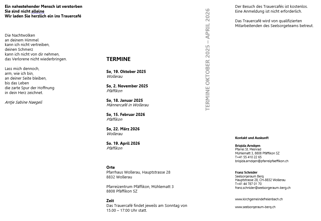Das Trauercafé wird in Zusammenarbeit zwischen dem Seelsorgeraum Berg und den Pfarreien St. Adelrich, Freienbach und St. Meinrad, Pfäffikon SZ durchgeführt. Wir treffen uns abwechslungsweise in Wollerau und in Pfäffikon SZ. Neu findet das Trauercafé am Sonntagnachmittag statt. Wir möchten damit auch berufstätigen und jüngeren Menschen die Möglichkeit geben, zu uns zu kommen. Ebenfalls neu wird es auch ein «Männercafé» geben. So können sich männliche Teilnehmer untereinander austauschen.